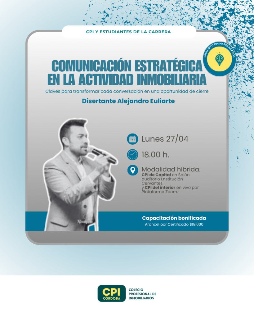 Una nueva capacitación se suma al calendario académico del CPI: Comunicación estratégica en la actividad inmobiliaria. El encuentro busca abordar las claves para transformar cada conversación en una oportunidad de cierre y será dictado por Alejandro Euliarte.