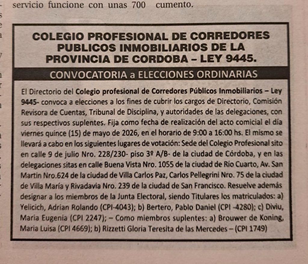El Directorio del Colegio profesional de Corredores Públicos Inmobiliarios – Ley 9445- convoca a elecciones a los fines de cubrir los cargos de Directorio, Comisión Revisora de Cuentas, Tribunal de Disciplina, y autoridades de las delegaciones, con sus respectivos suplentes.