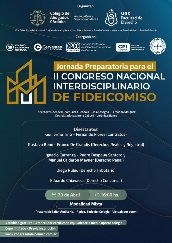 La actividad es organizada por el Colegio de Abogados de Córdoba y la Facultad de Derecho de la Universidad Nacional de Córdoba, junto a diversas instituciones del ámbito académico y profesional, y cuenta con la participación del CPI como entidad coorganizadora, reafirmando su compromiso con la formación continua y el trabajo interdisciplinario.