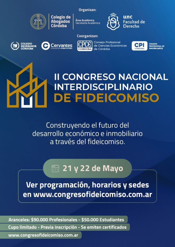 El Colegio Profesional de Inmobiliarios de Córdoba (CPI) invita a sus matriculados a participar del II Congreso Nacional Interdisciplinario de Fideicomiso, un espacio académico de alto nivel que reunirá a profesionales y especialistas vinculados al desarrollo económico, jurídico e inmobiliario.