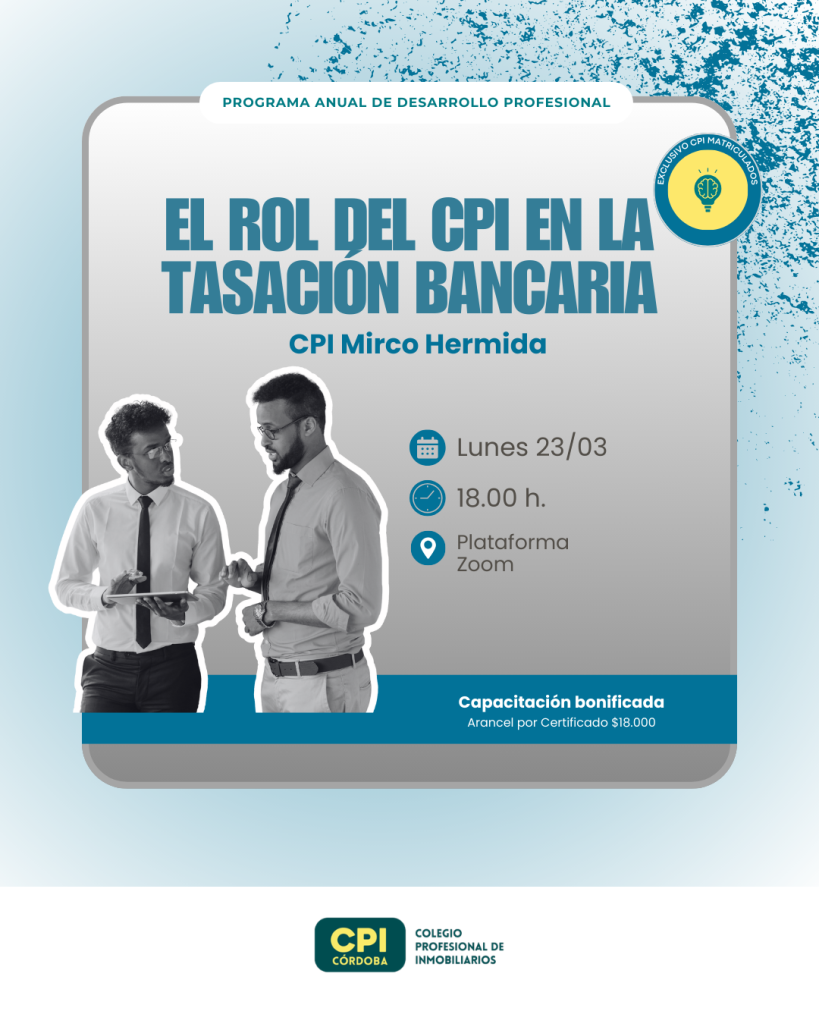 En el marco del Programa Anual de Desarrollo Profesional, lanzamos la capacitación «El rol del CPI en la Tasación bancaria». El encuentro será encabezado por CPI Mirco Hermida, y se dictará el próximo Lunes 23 de marzo, a las 18.00h., por Plataforma Zoom.