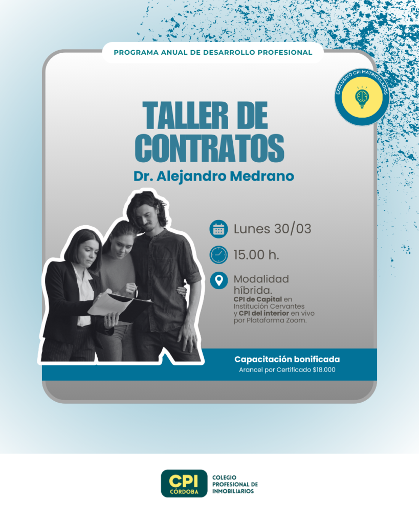 En el marco del Programa Anual de Desarrollo Profesional, lanzamos la capacitación «Taller de Contratos». El encuentro será encabezado por Dr. Alejandro Medrano, y se dictará el próximo Lunes 30/03 bajo modalidad híbrida. Esta opción permitirá a los CPI de Córdoba capital asistir de manera presencial a Institución Cervantes, y a CPI del interior provincial a unirse de manera virtual y sincrónica (en vivo).